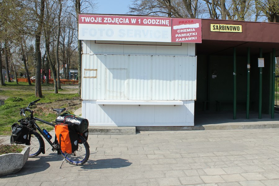 Jezioro Jamno (Jamund-See) beginnt. Hier geht es über eine schmale Nehrung, die den See vom Meer trennt. In Łazy (Lasse), am anderen Ende des Sees, meldet sich der Hunger. Doch auch hier steckt noch alles im Winterschlaf der Vorsaison. Nicht mal laue Pommes gibt es für meinen knurrenden Magen.