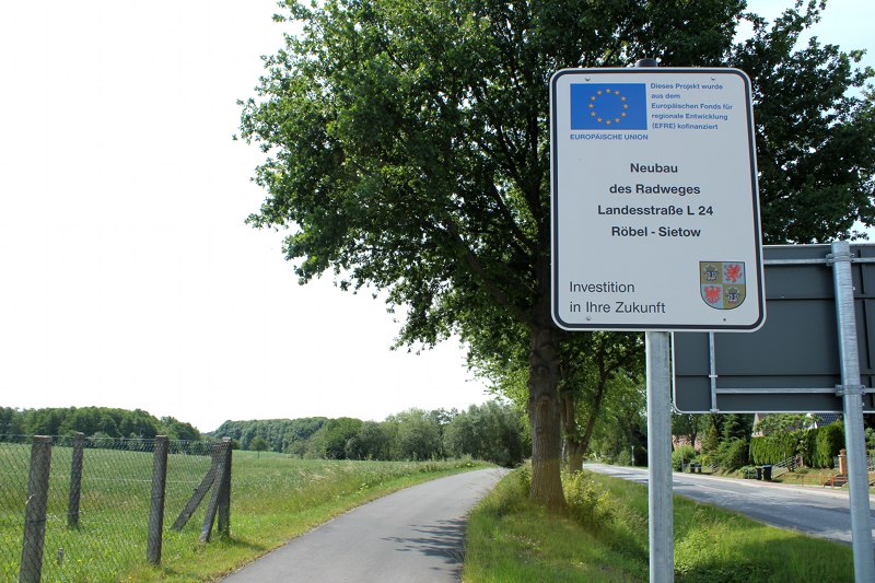 In Sietow beginnt ein neuer Radweg, der bis ins neun Kilometer entfernte Röbel führt. Er wurde mit Mitteln der EU geschaffen, worauf ein Schild stolz hinweist. Man könnte es aber auch so lesen, dass im Land der Luxusautobahnen keine Kohle für einen läppischen Radweg da ist.