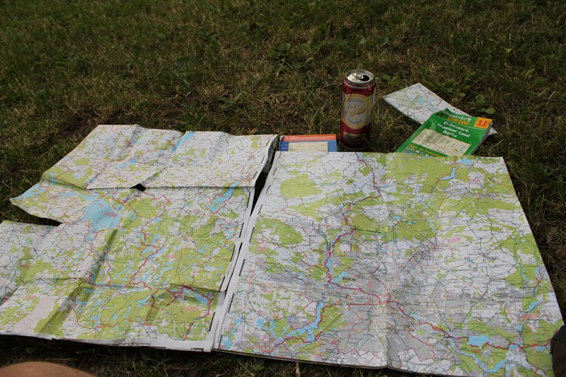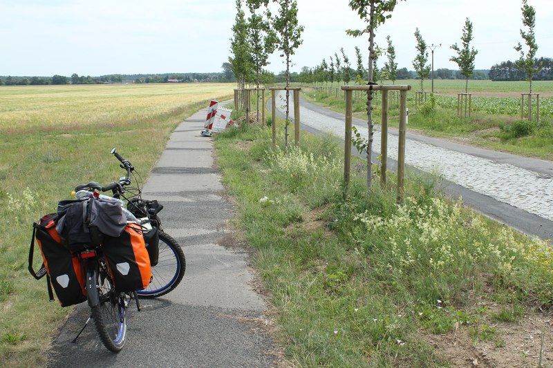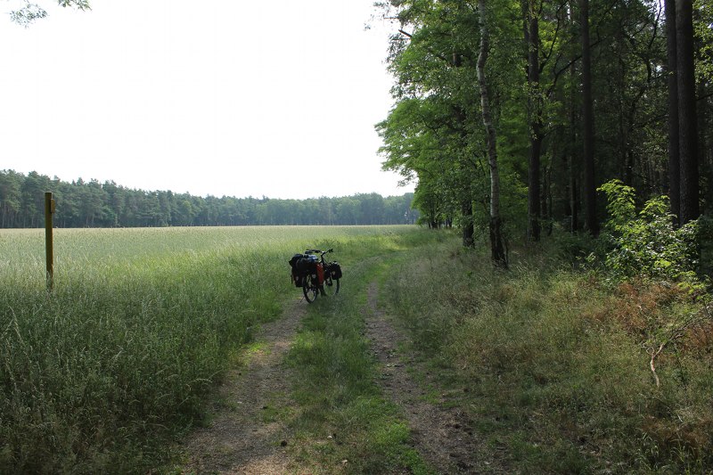 Alles könnte so einfach sein, wären da nicht diese kleinen Brandenburgischen Quasi-Landsträßchen. Kurz bevor ich losfahre, rät mir jemand auf dem Campingplatz, "über die Dörfer" zu fahren. Die Bundesstraße sei zu gefährlich, und außerdem gebe es viel mehr zu sehen. Ich lasse mich überreden und lande hinter Seebeck prompt im Wald. Wieder habe ich einen miesen Sandweg unter den Laufrädern, diesmal noch gespickt mit Zweigen, Tannenzapfen und allerlei anderem Zeugs, dass in Wäldern für gewöhnlich von den Bäumen fällt.