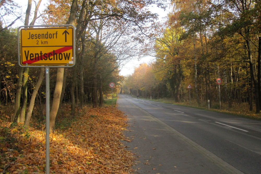 Hinter Klefeld geht es kurz auf die B104, bevor ich am 99 Meter hohen Homberg in einen Feldweg nach Ventschow einbiege. In Liessow habe ich endlich wieder glatten Asphalt unter den Rädern. Bergab geht es dann hinter Rubow, wo ich einen endlosen Berg mit an die 30 Km/h hinunter rollen darf. So recht kann ich mich nicht darüber freuen, denn in aller Regel muss man das mit entsprechenden Anstiegen wieder bezahlen. Aber ich nehme, was ich kriegen kann.