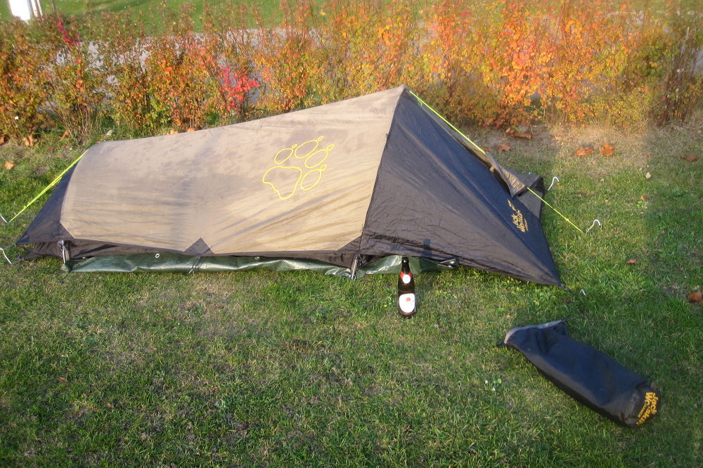 Das Jack Wolfskin Gossamer ist ein kleines, leichtes und günstiges Ein-Mann-Zelt. Es hat ein recht geringes Packmaß und eignet sich so ideal für kurze Radreisen. Erkauft wird das alles mit einem recht geringen Platzangebot im Inneren, sprich es ist furchtbar eng im Zelt. Und damit sehr unkomfortabel. Eine Hose an- oder auszuziehen erfordert akrobatische Gelenkigkeit, und auch das Ein- und Aussteigen ist an eine gute Körperbeherrschung gebunden.