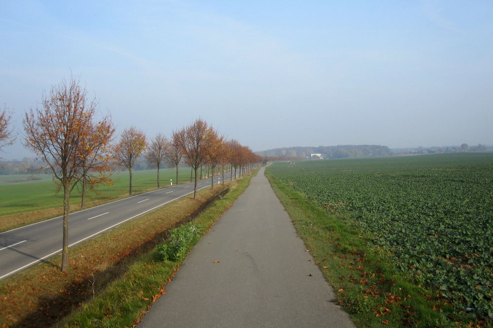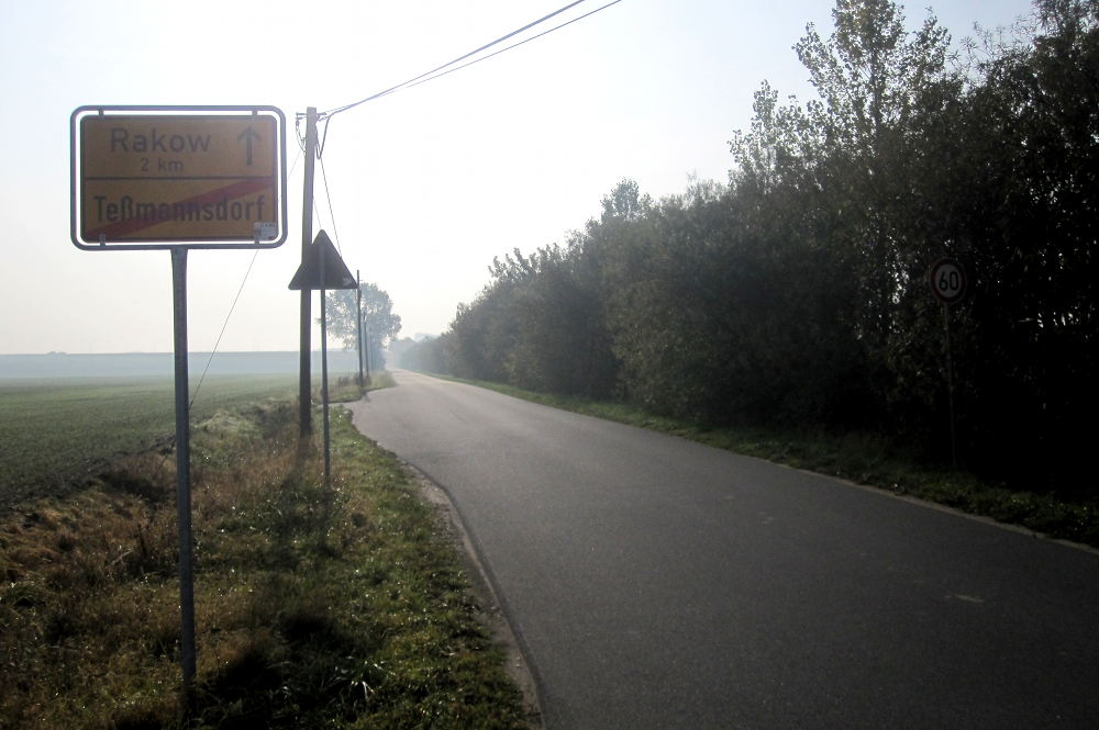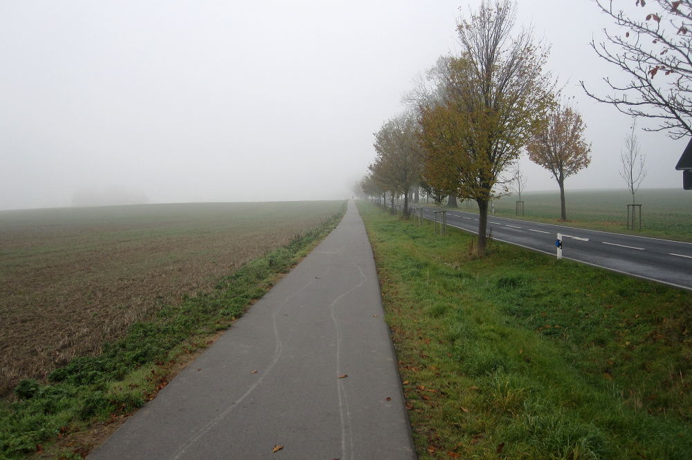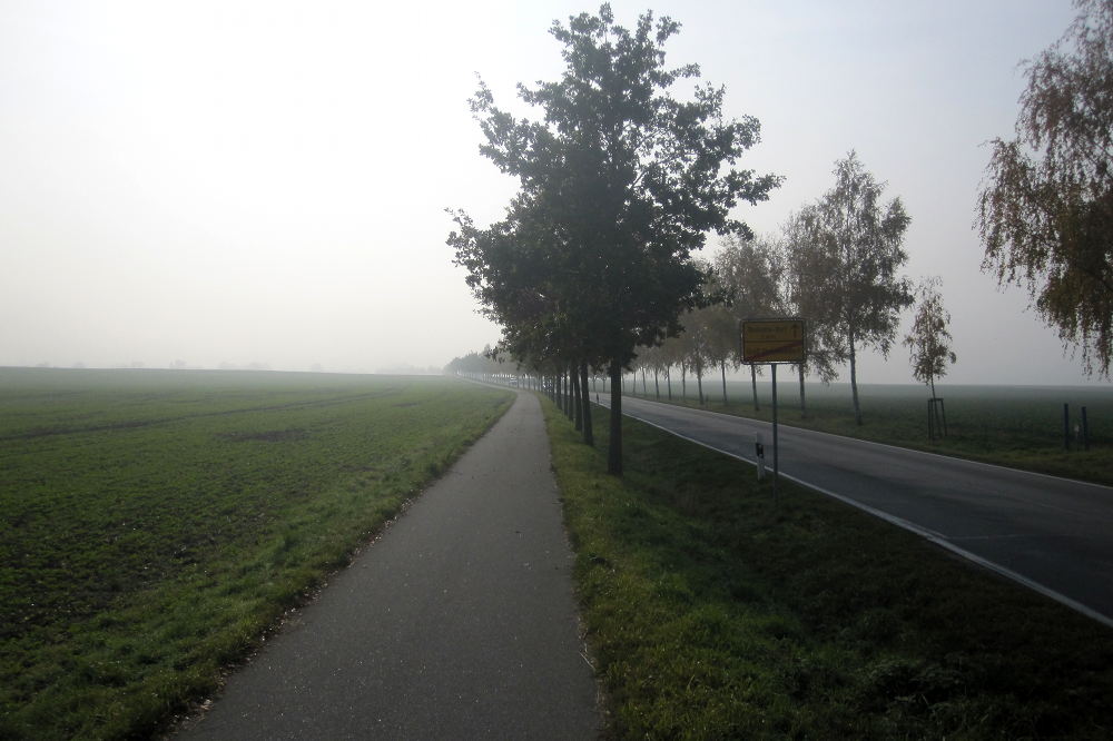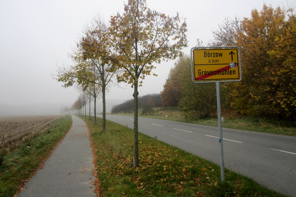 Es geht weiter nach Gägelow, wo die B105 nach Grevesmühlen vorbei führt. Mir stehen hier die radweglose und lärmige Bundesstraße sowie eine schöne Landstraße mit Radweg zur Auswahl. Letztere führt - wohin wohl? - nach Boltenhagen und Klütz. Egal, besser ein Umweg durch schöne Landschaften, als der Roadkill im Nebel. Trotzdem lege ich ausnahmsweise eine Signalweste an.