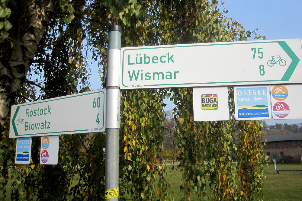 Der Abbau von Zelt und Gerödel nimmt ein wenig Zeit in Anspruch. Aber allzu eilig habe ich es auch nicht, da ich heute wieder im eigenen Bett schlafen kann. Mit vollgepacktem Rad geht es bei bestem Wetter wieder auf den Ostseeküstenradweg in Richtung Wismar. Dass es sich dabei um einen sehr bekannten und auch touristisch relevanten Fernradweg handelt, wird nicht immer ersichtlich.