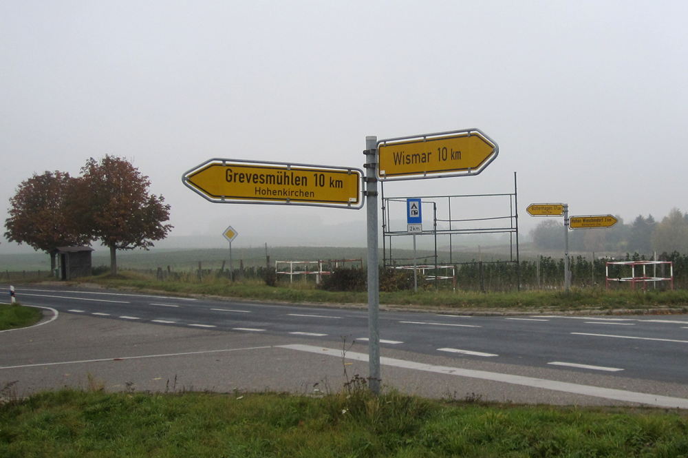 Und ich habe richtig gewählt! Zuerst geht es über ein paar Kilometer stetig bergab, dann kommt eine Abzweigung nach Grevesmühlen. Nur noch über ein paar lästige Hügel zwischen Hohenkirchen und Groß Walmsdorf, und schon bin ich in Grevesmühlen.