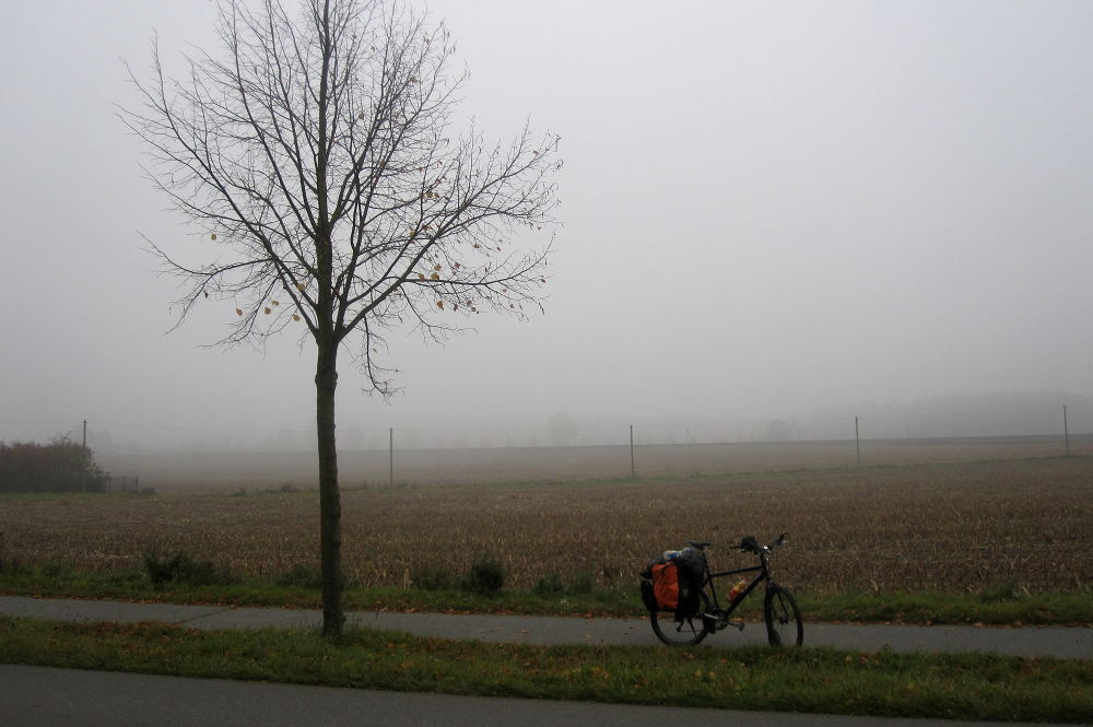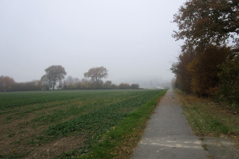 Bis in zu den ersten Wismarer Vororten ist noch so manche Steigung zu bewältigen. Kein Wunder, denn es geht von Meereshöhe knapp über Null in Rerik bis auf knapp 60 Meter am Scharberg bei Boiensdorf. Mit der Zeit wird es zunehmend nebeliger. Und damit kälter. Nun muss ich am hellichten Tage wieder die Handschuhe überstülpen.