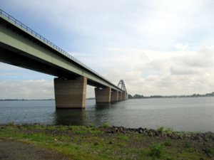 Um neun Uhr verlasse ich Großenbrode in Richtung Fehmarn. Der Einfachheit halber (und mangels geeignetem Kartenmaterial für Deutschland) folge ich den Radwegweisern am Ortsausgang. So erreiche ich die Fehmarnsund-Brücke nach einem kleinem Umweg, komme aber in den Genuss, das Bauwerk mal von unten bewundern zu können.