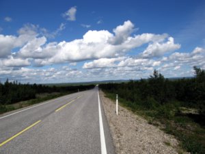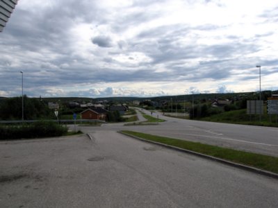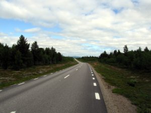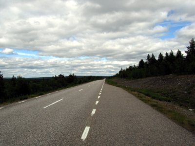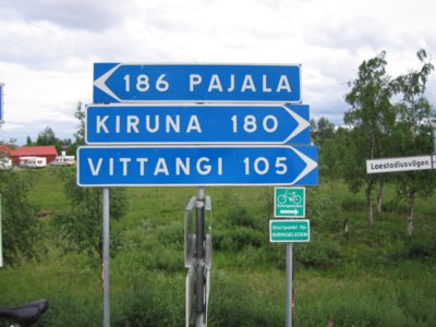 Diesmal komme ich mit zehn Uhr erst spät los. Der Himmel ist bewölkt, es regnet aber nicht und somit ist das Wetter eigentlich ganz in Ordnung. Nach einem kurzen Plausch mit dem Hamburger Paar geht es auf E45, die ich heute bis zu ihrem Endpunkt an der finnischen Grenze in Karesuando beradeln will. Hier im hohen Norden Schwedens dünnt der Verkehr soweit aus, dass mich nur noch wenige Autos beim meditativen Radeln stören. Die Topographie ist angenehm, nur wenige Steigungen bringen mich aus dem Rhythmus. Die Vegetation ändert sich zusehends - die Bäume der umliegenden Wälder werden wegen der immer kürzeren Vegetationsphasen kleiner und kleiner. Allerdings ändert sich dieses Landschaftsbild kaum mehr, so dass die Etappe stellenweise recht langweilig wird. Ständig schaue ich auf den Tachometer und sehe zu, wie ich mich Kilometer für Kilometer meinem Ziel nähere - 100, 99, 98, 97, usw..