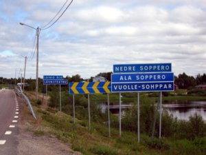 Dreisprachige Ortschilder: Schwedisch, Finnisch, Samisch