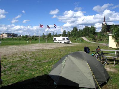 Der erste Eindruck der überwiegend von Samen bewohnten Siedlung ist zwiespältig. Die Häuser stehen wie lose über die Landschaft gestreut in der Tundra umher. Einen Ortskern gibt es auch hier nicht, was mich etwas besorgt, weil ich einen Geldautomaten brauche, um an Norwegische Kronen zu gelangen. Insgesamt wirkt Kautokeino trist und wenig einladend. Fast am anderen Ortsende finde ich schließlich ein Informationsbüro, wo ich nicht nur einen Internetzugang erhalte, sondern auch den Weg zur nächsten "Minibank" (= Geldautomat) gezeigt bekomme. Mit der Landeswährung ausgestattet, radele ich wieder zurück zum anderen Ende des Kaffs und quartiere mich im Campingplatz "Arctic Motel & Camping" ein.