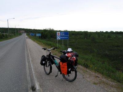 Es ist recht warm, und auch der Wind bläst moderat aus günstigen Richtungen. Selbst die gelegentlich auftauchenden Hügel sind unter diesen Umständen kaum der Rede wert. Noch auf finnischem Gebiet treffe ich auf das ältere Berliner Radlerpaar, das ebenfalls auf dem Weg zum Nordkap ist. Seit Vittangi radele ich immer wieder an den beiden vorbei, was stets Anlass für einen kleinen Plausch ist. Auch dieses Mal unterhalten wir uns für ein paar Kilometer, bis ich wieder in die Pedalen trete und in meinem eigenen Rhythmus und Tempo nach Norden radele.