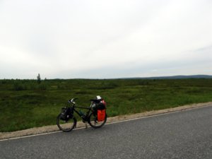 Von Zeit zu Zeit ergeben sich auch faszinierende Ausblicke über die weite hochnordische Landschaft. Das lenkt mich dann stets von meiner mental verkrampften Fahrhaltung ab. Überhaupt empfinde ich das Radeln hier, wo sich die Landschaften nun langsam grundlegend von den heimischen unterscheiden, als viel spannender und abwechslungsreicher, als etwa weiter im Süden. Nach der Hälfte der Strecke treffe ich auf ein deutsches Radlerpaar in fortgeschrittenem Alter (>60 Jahre), das von Berlin aus ebenfalls auf dem Weg zum Nordkap ist. Sie machen keine so langen Etappen, sind aber fest entschlossen, ihr Ziel bald zu erreichen. Angesichts meiner eigenen Mühen und der Tatsache, dass beide nicht wie langjährige Sportprofis wirken, habe ich großen Respekt vor ihrer Leistung und Entschlossenheit.