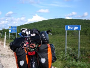 Die Grenze nach Norwegen ist zwar mit Schildern markiert, doch auch hier sind weder Zoll- noch Grenzhäuschen besetzt. Das wundert mich ein wenig. denn immerhin handelt es sich hier um eine EU-Außengrenze. Mit dem Beradeln norwegischen Bodens scheint sich prompt die Landschaft zu ändern. Die in Finnland bereits sehr niedrig gewordenen Wälder verschwinden plötzlich komplett. An ihre Stelle treten niedrige Büsche und Krüppelkiefern, was die Landschaft in ihrer Weite ein erstes Mal "fjellhaft" aussehen lässt. Dieses hochnordische Ambiente motiviert mich ungemein und macht mich geradezu euphorisch. Fasziniert von dieser Umgebung trete ich lustvoll in die Pedalen und laufe zur Hochform auf.