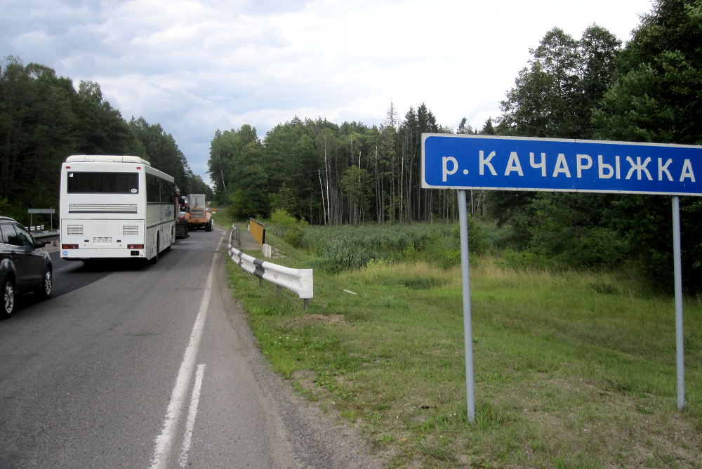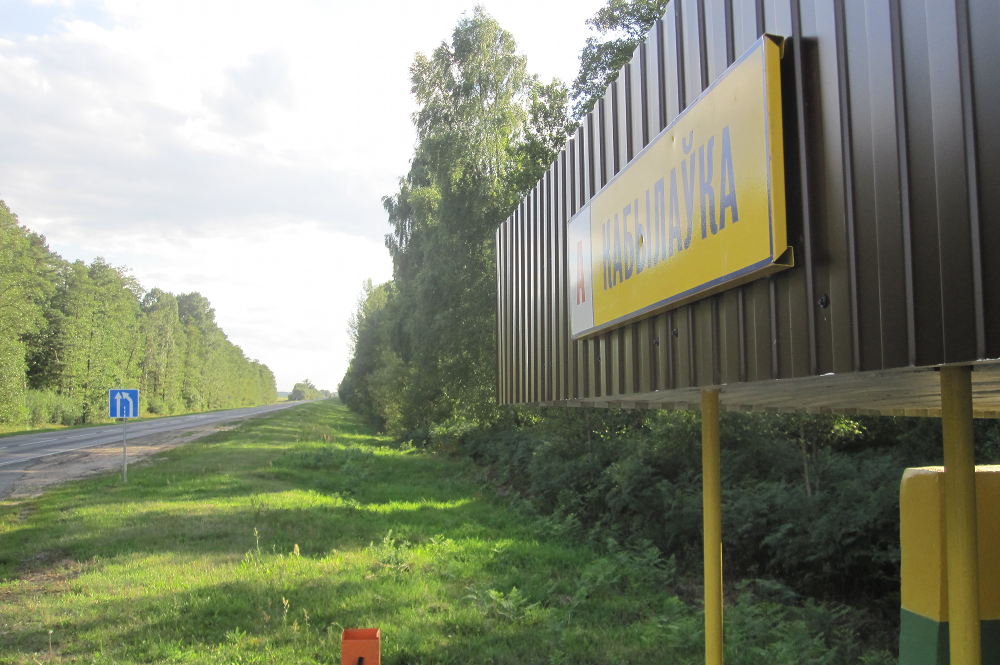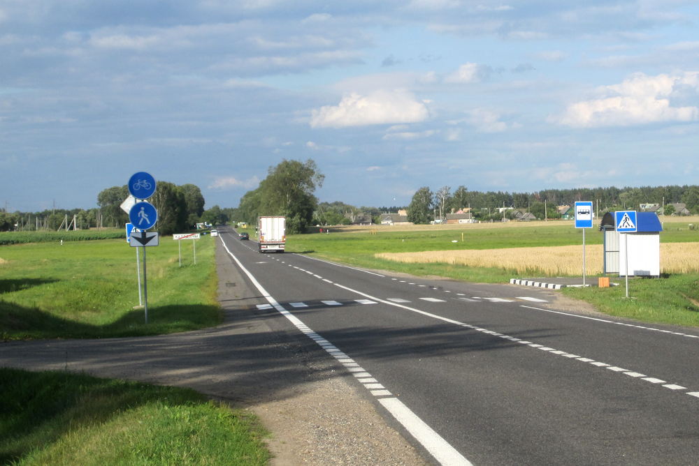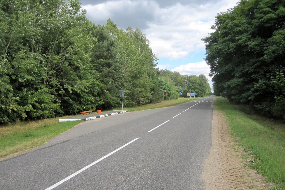 Es wird hügelig. Passend dazu geht Claudias Vorderreifen die Puste aus, was eine kleine Reparaturpause nötig macht. Der Verkehr wird hier zunehmend dichter, ist aber noch gut zu ertragen. Auch die LKW-Fahrer überholen in aller Regel mit reichlich Abstand. Weiter geht es auf der P99, wo das erste Mal Minsk ausgeschildert ist.