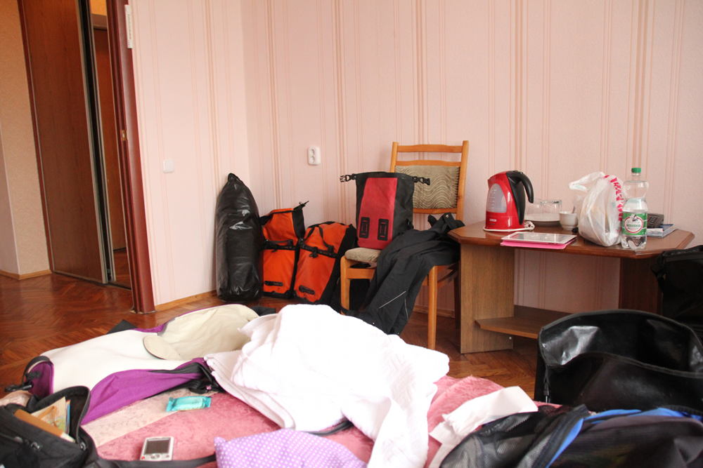 Doch man weiss sich zu helfen. Sie telefoniert eine Kollegin herbei, die ein wenig Englisch spricht. Und siehe da, ein wenig später beziehen wir unser äußerst geräumiges Zimmer, das noch im Sowjetstil eingerichtet ist. Wir fühlen uns sofort wohl. Und die Räder werden im Technikraum des Schwimmbades eingeschlossen.