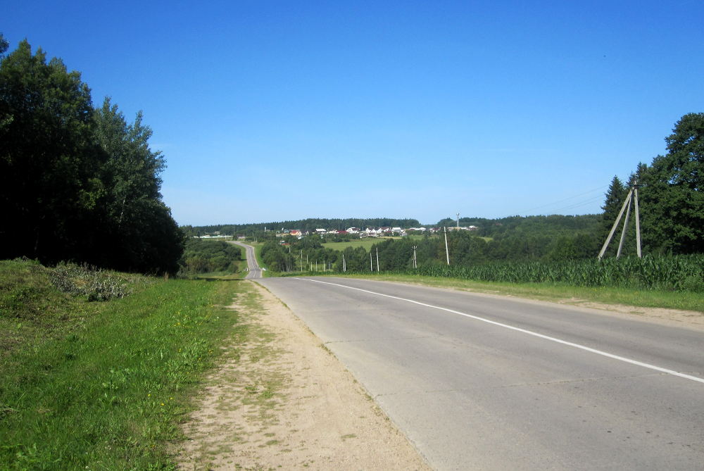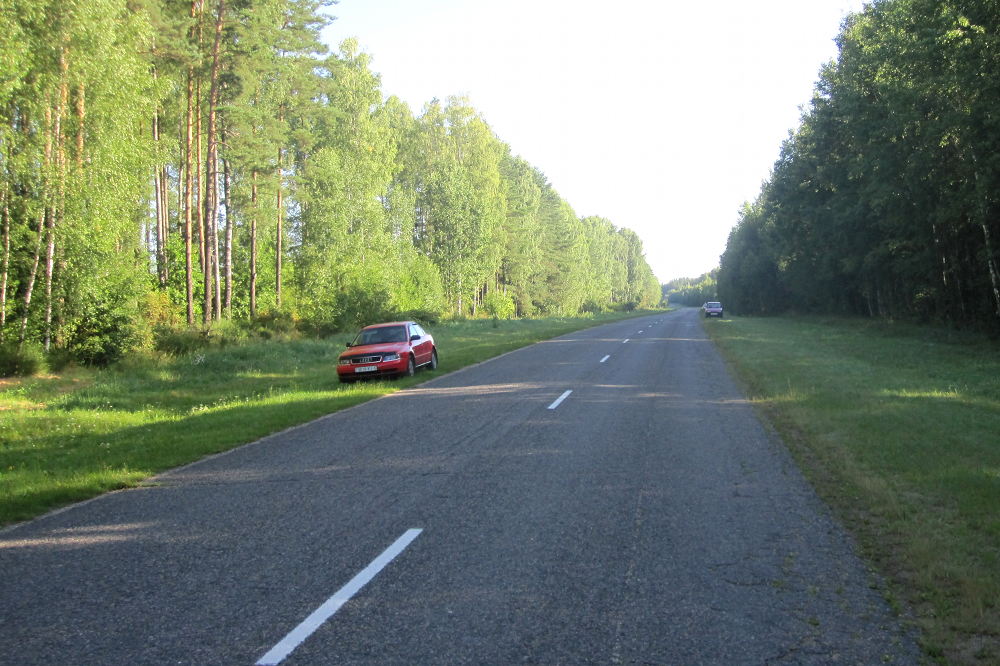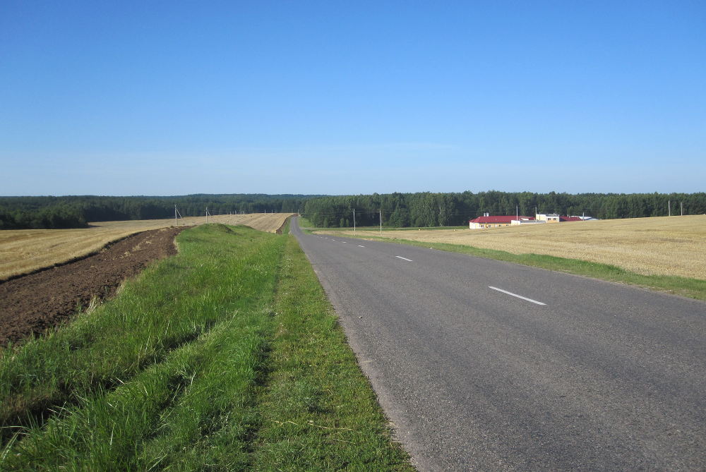 Gut ausgerüstet machen wir uns auf den Weg. Aus Baranawitschy rauszufinden ist nicht besonders schwer. Es geht weiter über die P2, die gleich am Ortsausgang sogar einen begleitenden Rad- und Fußweg besitzt. Dieser verschwindet aber, so schnell er aufgetaucht ist. Es sind etwa sechzig Kilometer bis zur nächsten größeren Stadt namens Stoubcy. Der Verkehr ist moderat und es würde sich sehr entspannt radeln, wäre die Gegend nicht so hügelig.