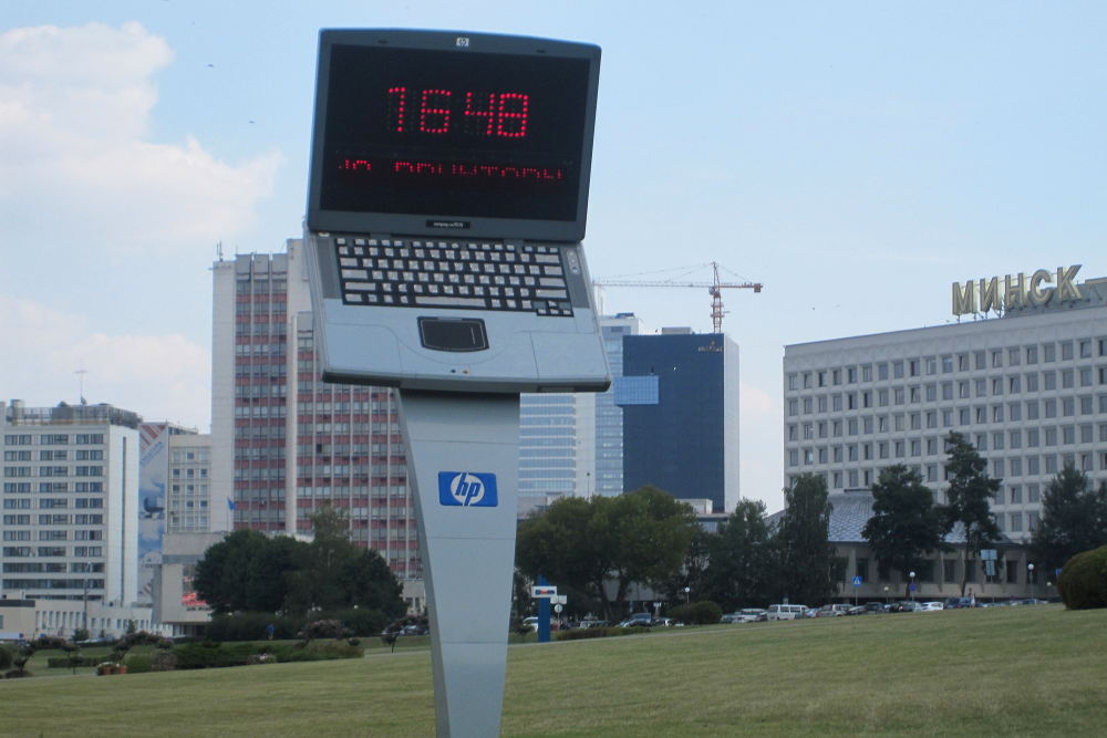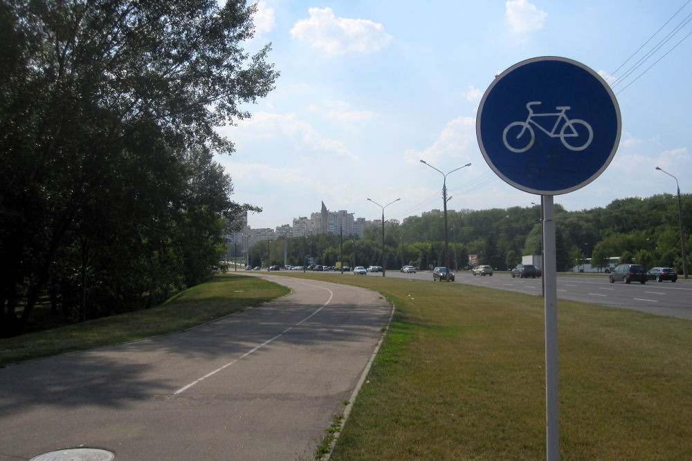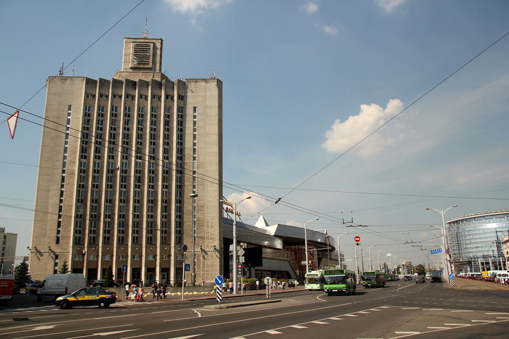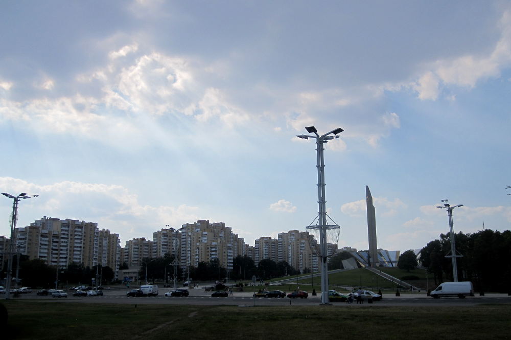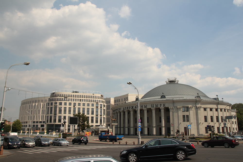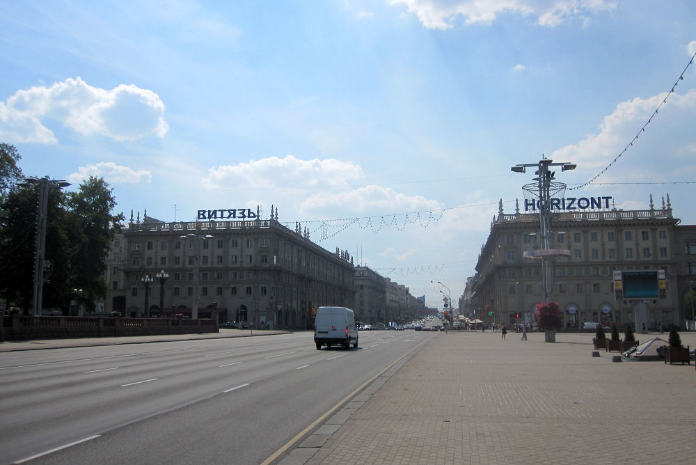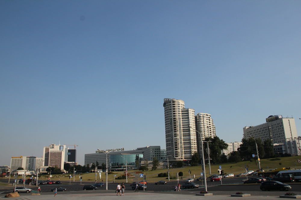 Minsk hat knapp zwei Millionen Einwohner und ist damit die größte Stadt Weißrusslands. Uns so dauert es eine Weile, bis wir im Zentrum ankommen. Obwohl wir keinen Stadtplan besitzen, fällt uns die Orientierung nicht schwer. Die Ein- und Ausfallstraßen verlassen das Zentrum sternförmig, so dass wir einfach nur geradeaus radeln müssen.