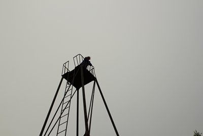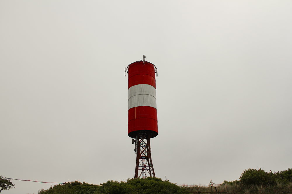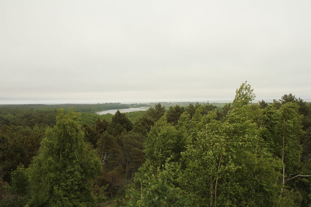 Müllers Höhe, die mit ihren 43 Metern zu den höchsten der Nehrung zählt. Man hat einen schönen Rundweg durch das Naturschutzgebiet angelegt. Leider sind alle Hinweistafeln auf Russisch. Auf der Düne gibt es zwei Aussichtstürme, einen kleinen und einen großem. Letzterer ist eine dünne Stahlkonstruktion mit steiler Außenleiter und eine Herausforderung für die Nerven. Claudi schafft es als einzige von uns beiden bis auf die kleine Aussichtsplattform. Ich passe auf halbem Weg und schaue mir den Turm lieber von unten an. Zum anderen gibt es den