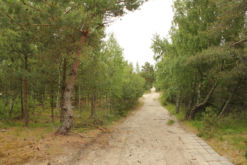 Weiter geht es über die Nehrungsstraße, die abschnittsweise recht kurvig verläuft. Auch die Vegetation ändert sich; mal umgibt uns der dichte Mischwald, dann wieder lockerer Fichtenwald. Gelegentlich sind in Dünen zu erkennen.