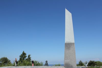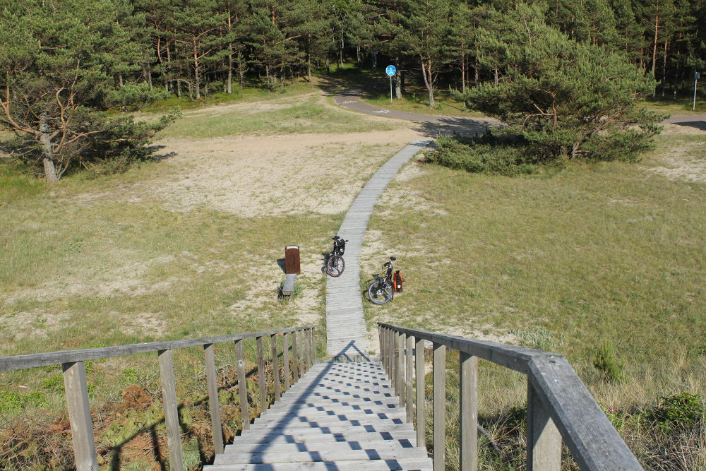 Parniddener Düne mit ihrer Sonnenuhr und ihrem naturkundlichen Lehrpfad. Mit den Rädern fahren wir bis an ihren Fuß, dann geht es über eine steile Treppe nach oben. Die Aussicht über die weiten Dünenfelder und das Haff ist grandios. Auch einen Parkplatz gibt es hier, für all die fußlahmen Autler.