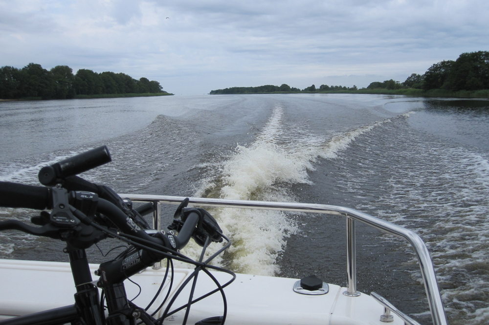 Nach Šilute fahren wir nicht mit unseren Rädern, sondern mit dem Boot. Die Fahrt über das Haff erspart uns den lästigen Umweg über Klaipeda, das sich leider nicht umradeln lässt - genauso wenig wie die autobahnähnliche 141 bis etwa 20 Kilometer vor der Stadt. In Nida gibt es einige Anbieter für solche Überfahrten. Unserer ist der Bruder unseres Pensionswirtes. Er bringt uns nicht nur zügig ans litauische Festland, sondern erklärt uns noch so manch Wissenswertes zu Haff und Memeldelta.