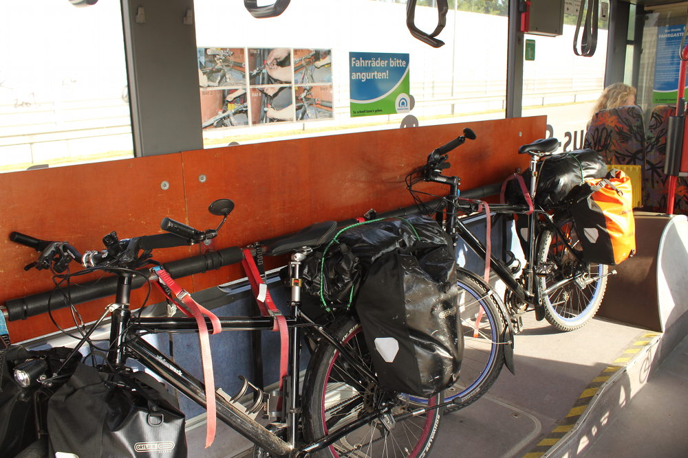 Fast zu Hause: Reiseräder im Shuttlebus am ärgerlichen Herrentunnel in Lübeck