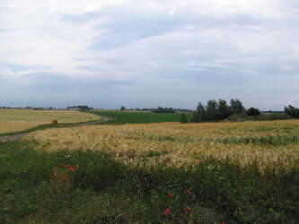 Svarte konnten wir einem gut ausgebauten Radweg direkt an der Küste folgen, der dann aber leider aufhörte. Radler wurden dann über Nebenstraßen ins Inland geleitet, auf denen das Verkehrsaufkommen zwar erträglich war, wir dafür Bekanntschaft mit dem schonischen Hügelland machen konnten (Hauptsache, dem KFZ-Verkehr bleibt die flache und schöne Küstenstraße...). Fortan ging es bei beständigem Auf und Ab durch die weiten Agrargebiete des südlichen Schonens. Diese immergleiche und eintönige Landschaft, die uns bis Trelleborg begleiten sollte, besteht im wesentlichen aus Äckern und Feldern, in denen wie Inseln verstreut Gehöfte liegen. Um den Wind etwas abzumildern, haben ihre Bewohner Bäume um die Anwesen gepflanzt. Ansonsten gibt es nur weite Äcker und Felder, was uns Radler mit zwei speziellen Problemen konfrontierte: Zum einen gab es keine Hindernisse für den heftigen Gegenwind, zum anderen gab es auch kaum Gelegenheiten, unbeobachtet einigen menschlichen Bedürfnissen nachzugehen.