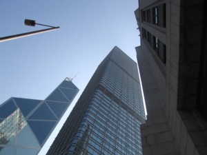 Links der Turm der Bank of China (367 m), daneben das Cheung Kong Centre (283m)