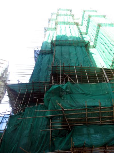 Auch entdecken wir Rohbauten, die bis in enorme Höhen hinauf komplett mit Bambusgerüsten eingekleidet sind. Die Gerüste bestehen aus einzelnen Bambusstangen, die kreuzweise zusammengebunden sind und unten ohne weitere Einfassung auf dem Boden stehen. Diese traditionelle Art des Gerüstbaus scheint entgegen dem optischen Eindruck durchaus stabil zu sein, da viele selbst sehr hohe Hochhäuser mit ihrer Hilfe errichtet werden. Einzig an den riesigen Wolkenkratzer-Rohbauten sieht man moderne Stahlgerüste.