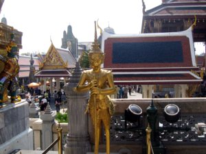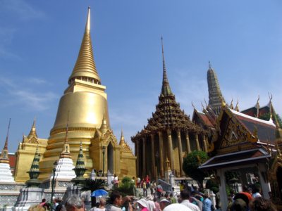 Wir passieren die Kleiderkontrolle, da man die Tempelanlagen nur in würdiger Kleidung betreten darf. Mit kurzen Hosen oder schulterfreier Oberbekleidung wird man nicht hineingelassen. Dennoch wundern wir uns später über viele nicht angemessen bekleidete Touristen, die wohl zu Reisegruppen gehören, deren Leiter die Sittenwächter mit ein paar Baht (THB) bedacht haben. Anschließend zahlen wir 250 THB pro Nase Eintrit und stehen gleich darauf staunend inmitten einer asiatischen Sakralarchitektur, die üppiger und prächtiger nicht sein könnte. Herausragend ist die Dreiergruppe aus unterschiedlich gestalteten Chedi (Tempeltürmen), die einen legendären Anblick bietet. Der an erster Stelle stehende