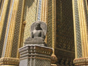 Samaragdbuddha, die von den Thai wohl am höchsten verehrte Buddhastatue überhaupt. Erbaut wurde die Anlage ab König Rama I, weitergestaltet dann von den nachfolgenden Monarchen. Wat Phra Kaeo hat die Funktion des Haustempels der thailändischen Könige und wurde erst in jüngerer Zeit dem Publikum geöffnet.