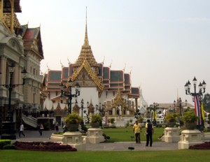 Chakri-Gebäudegruppe, vor der sich ein sehenswerter asiatischer Ziergarten mit Zwergbäumchen und Skulpturen befindet. Das Ensemble wurde 1867 von einem englischen Architekten im neoklassizistischen Stil errichtet und wirkt deshalb recht europäisch. Durch einen Seiteneingang im Palast gelangt man in ein kleines Waffenmuseum, an dem wir jedoch vorbei gehen. Auch die Sammlungen und den Thronsaal im Inneren lassen wir mangels Interesse aus. Wesentlich mehr Aufmerksamkeit schenken wir der anschließenden