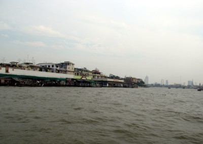 Tha Tien, dem Pier der Pendelfähre. Weil der Fluss an beiden Seiten nahezu völlig zugebaut ist, lassen sich die Ablegestellen der Fähren und Expressboote nicht ohne weiteres finden. Man folgt den Schildern auf dem Bürgersteig und kommt oft in markthallenähnliche Gänge und Gassen, an deren Ende dann, zwischen Garküchen und Verkaufsständen, die Piere sind. Für die Fähre auf die andere Seite zahlen wir stolze drei (!) THB, also sechs Eurocent.