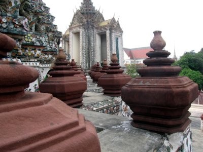 Der Eintritt in Wat Arun beträgt 20 THB und hat eher den Charakter einer Spende für den Erhalt des Bauwerks. Auf dem Tempelgelände stehen viele Gebäude; in einigen von ihnen ist eine Schule untergebracht, in der buddhistische Mönchsnovizen mit dem Schriftstudium beschäftigt sind. Wir gehen zu Phra Prang und bestaunen die filigranen Verzierungen des riesigen Tempelturms, die aus der Ferne nicht zu beobachten sind. Über steile Treppen gelangt man auf mehrere Ebenen, auf denen man den Prang rituell umrunden kann und nebenbei einen schönen Blick über den Fluss erhält. Leider sind die oberen Etagen geschlossen. Immer wieder erstaunt uns der Detailreichtum der Verzierungen und Figuren, die Phra Prang schmücken. Der Prang selbst ist umgeben von vier kleineren Prangs sowie vier reich verzierten