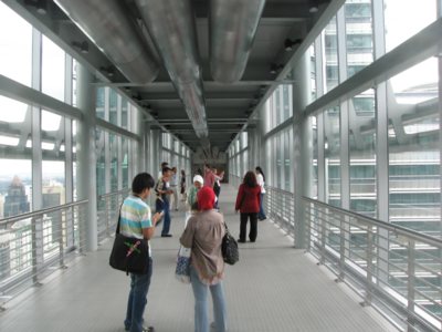 Unser Besichtigungstermin ist am späten Nachmittag. Wir reihen uns in die Schlange ein und müssen zunächst eine Kleidungs- und Gepäckkontrolle passieren. Anschließend warten wir in einem Raum, in dem ein recht patriotischer Film von Bau und Konzeption der Petronas Towers berichtet. An Modellen kann man Details studieren, so etwa die Fassadengestaltung oder die Wirkung der Konstruktion bei Gewitter. Mit einem Lastenaufzug geht es in Begleitung einer Angestellten schließlich zur Skybridge, wo wir eine Viertelstunde Zeit haben, die imposanten Ausblicke auf uns wirken zu lassen.