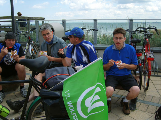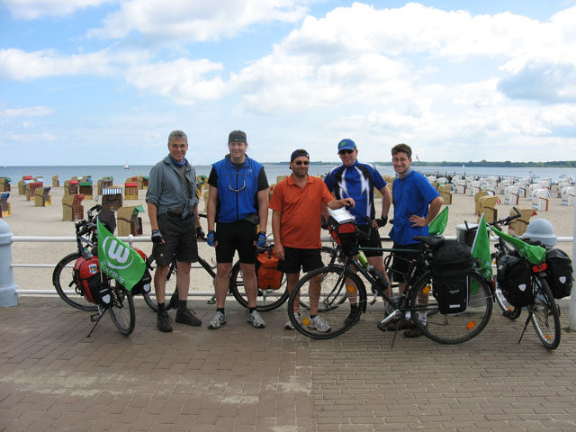 Ich begleitete die Vier auf ihrem Weg von Lübeck über die Holsteinische Ostsee-Bäderstraße bis nach Süsel, wo ich dann mangels freier Tage leider wieder zurückradeln musste. Dennoch ergab sich eine veritable Tagestour - diesmal in der netten und kurzweiligen Begleitung vierer Radreisender und Fußballfans. Ihr Verein, der VfL Wolfsburg, hatte am Tag darauf ein wichtiges Spiel um die deutsche Meisterschaft. Und so prangten zur moralischen Unterstützung die grünen Vereinsflaggen an ihren Rädern. Denn auch auf Radreise lässt sich prima Flagge zeigen!