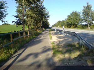 Km 33 - 53: In Bad Oldesloe gerate ich auf die B75, die ab hier bis Hamburg mit einem durchgängigen Radweg gesegnet ist. Zwischen Oldesloe und Lübeck gibt es diesbezüglich noch erhebliche Lücken, was ein Umfahren der verkehrsreichen Straße ratsam macht. Bei Kilometer 40 lege ich eine erste Rast ein und esse eine öde Stulle, bevor ich gezwungen werde, den Radweg kurz zu verlassen und Neritz zu durchqueren. Zwar herrscht hier kein Verkehr, dafür besteht das komplette Kaff aus alternativlosem Kopfsteinpflaster, was für den Radler besonders erfreulich ist.